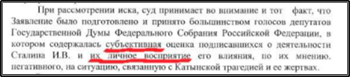 Помимо Постановления Конституционного суда, куда верховные жрецы секты «святого Йозефа» таскали туманным образом обнаруженные «мощи» лживейшего из лжецов в виде «копий» «документов» - имеется ещё пять Решений различных судов Российской Федерации по оценке событий в Катынском лесу. В четырех из этих пяти Решений по фактам необоснованных обвинений (читай - клеветы) на Сталина в Катынском расстреле, несмотря на высокий градус политизированности вопроса - содержатся судебные указания о всего лишь «допустимости» этих клеветнических, по сути, высказываний, квалифицируемых судами как «оценочные суждения», которые в демократическом обществе почему-то необязательно доказывать.