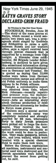 - История с массовыми захоронениями в Катыни, которая вызвала мировую сенсацию два года назад, была пропагандистским трюком, инсценированным Геббельсом и Риббентропом, чтобы вызвать раскол между Россией и её западными союзниками, говорится в отчёте, полученном здесь по специальным каналам, который подкрепляется сообщением сегодня вечером из Осло. Утверждается, что близкий сотрудник Гиммлера, бригаденфюрер СС Шелленберг, сообщил эту сенсационную информацию во время допроса в штаб-квартире Союзников в Германии в прошлый вторник. Цитируются его слова о том, что 12000 тел были вывезены из немецких концентрационных лагерей и одеты в старую польскую форму, чтобы они выглядели как польские офицеры.